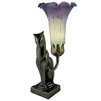 The photo of this lamp is nice, the lamp is even better. The glass shade has to be seen to be believed. The coloring is very subtle, with the deep purple lacy top shading to the dark green throat, it has a fine veiny silouette through out, really beautiful. The cat itself is not so detailed, giving it a more powerful raw apearance.