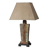 The lamp is well made and a spectacular mix of slate and hand-pounded copper. The shade is suade. It is a perfect match for the honey-oak lamp tables that have slate inserts. We could'nt be happier with the product, the price or the transaction. Cudos.