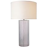 I purchased this lamp not fully realizing that it is a large table lamp. But that just adds to the extremely solid appearance. The base of the lamp is reeded, a heavy texture, almost simulating water. It is open on the bottom, but you wouldn't know that. It theoretically would allow you to put something in there, but it's so elegant on its own, why do that? The name of it says "Clear Blue" which was one of my primary motivators -as I have blue touches throughout my living room. I see no hint of blue, but it is a clear, thick, textured glass. One of the most amazing purchases I've made and I highly recommend. It required the most minor of assembly, and parts were clearly labeled and an instruction sheet filled in the gaps. Took me longer to get rid of the packing material than it did to assemble and place this beautiful light.