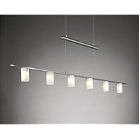 I saw this for over $1,000 in some stores and have also seen it featured in the dining rooms of 2 homes on "million dollar real estate". It's simply elegantly simple. No one seems to be able to figure how it powers through the thin wires without them being "live" wires but it does...perhaps the middle bar does something; I am no electrician but men are always the ones to remark on that.It lights up the dining table down the middle rather than one mere spot. It is simple to change bulbs and you merely move the middle bar in the middle to raise or lower it so it's far easier to hang and get in the "exact right place" than any other chandelier I've had.