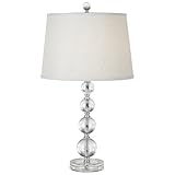 This lamp was the excellent solution for a small based table we use while reading. Our former lamp was a large diameter classic ginger jar lamp. However, with the large diameter it was a difficult fit for glasses, cel phone, etc.The stacked ball acylic lamp has a small diameter clear base, but is perfectly balance for a table. The clear acylic seems lighter in reflecting light. This lamp would work well with a mirror. There is plenty of room around it for glasses, a book, cel phone, kleenex box, etc. My mom like the "brighter" look of this lamp over the heavy ginger blue of the other lamp.