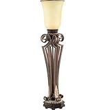 Note: The glass has a beautiful warm tan glow. The chandelier bulb is not included. The base for the bulb is in the middle of the white ring and hard to see. The bulb is the basic small size chandelier bulb, the size of the tip of your little finger. The on and off switch is on the cord near the base. There are dimmer plugs in stores like Home Depot if you want to control the lighting. The metal is done in a beautiful bronze color with perfection. This table lamp looks much more expensive in person. Also, the glass is thick enough so the bulb never shows through.