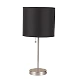 Very cute lamp. Great size for a side table. Lamp shade is quite large for the height but looks great. I would recommend this product.Like this lamp for my son's room. Convenient pull chain and smaller base make it perfect for a nightstand. Matches decor perfectly!