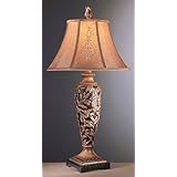 This is a Med to Large lamp the color is an antique taupe color with the swirls a brass, gold color. The taupe shade is very prettythe lamp would go with any decor and looks good in the living room or a bedroom. I highly reccommend this lamp!