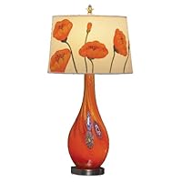 The lamp arrived promptly and in perfect condition. The base is a swirl of red and yellow starting dark red at the bottom and ending up orange at the top. I don't care for the lamp shade that came with it. It is covered with reddish and pinkish floweres, looks cheap and doesn't seem to compliment the base. I replaced it with a plain ivory barrel type shade and like it much better. The lamp compliments my room and I like it, however it seems a bit expensive considering I had to buy another shade.Sunday, March 9, 2014