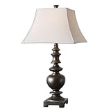 I bought this Uttermost Verrone lamp for my sofa table. It arrived well packaged in 2 packages, one for the lamp and another for the shade. The base of the lamp looks just like the picture; it is an oil rubbed bronze color with a subtle wash of very dark gold. However, the shade took me by surprise as the website picture makes it look off white although the description says it is a khaki linen fabric. It definitely is a khaki linen fabric and it has A LOT of brown slubbing throughout the shade in random patterns, not just up and down. This is the reason I gave 4 stars instead of 5; I think the picture on the website should show the correct color of the shade and it doesn't. When I saw the shade I thought it was going to look too dark and I'd have to return the lamp but when I put the lamp on the table it actually looked very good. I think the shade accents the lamp base and vice versa, they go together well. It's a unique looking lamp and makes my whole room look good. I'm very glad I bought it!