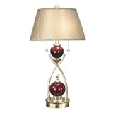 EDIT: used rubbing compound to get the haze off the one glass globe, and sent the broken lamp back for an exchange. Hopefully this time it arrives undamaged, i will post again when I know. Happy to say that returning/exchanging the item has been a breeze!This is a beautiful lamp with a lot of good things going for it. First of all, love the two pull chains. This really beats reaching your hand up and under a shade to find the little screw knob. Also great are the two beautiful red glass globes and the high-quality, absolutely lovely fabric shade. The shade's color is more of a taupe/beige/grey when the light is not on. It took about 2 minutes to assemble and it arrived in good shape although the shipping box looked worn and was a little damp. Before I mention the less-than-perfect items, you must know that I am an A-type personality and love symmetry. Also, there is No "Perfect Lamp" out there at least I have not found one in 35 years. It seems that no lamp is quite straight, and although this one is not either, it seems straight to the naked eye (I used a level to determine this). Also, there is the smallest scratch (about 1/8th of an inch) on one of the glass balls, but this is definitely not noticeable to anyone without getting within 3 inches of it. Finally, the bottom red globe is about 1/16th of an inch off-center but again this is not obvious. So after saying all this, I still find it nicer than some other expensive lamps I have. I'm not sure if I will buy a second one to match (I wanted to check one out first), or buy another Dale Tiffany with some red accents to complement this one. I am definitely keeping it.