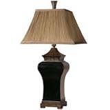 Make sure you measure carefully before you buy this lamp the shade is HUGE. I had to return it. Also the listing says distressed black base I believe but it is NOT distressed. It is a smooth and shiny black which gives it a more transitional bordering on contemporary look, rather than traditional. It really is a beautiful lamp and great quality, but it just didn't work in my home due to the size.This lamp is absolutely beautiful from the finish to the quality of the lamp. I purchased it after searching for over a month to get a lamp that would blend with my new oriental cocktail and end tables. My tables are bonded black leather with wonderful etchings of painted scenes in gold and muted red tones of women and men pushing carts, etc. To see it is to love it!