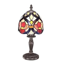 Shade is very pretty and blends in with décor.This is just what I was looking for! This is easily a $50 value lamp, it must be on sale. The glass is thick, the color are muliticolored woth the main ones being red and blue. It is beautiful small table lamp I use in my son's room next to the chair for reading books before bed. It takes a small 25wt bulb, but I have a small 40wt bulb since we only use it short amounts of time each night. I don't leave it on. Recommend as a perfect small lamp.