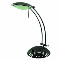 Customer review from the Amazon Vine Program The thing you'll notice first about this desk lamp is the base. It's giant (nearly eight inches across) not to mention extremely heavy--the base must weigh most of the lamp's six pounds. At least it won't be knocked over easily. The lamp works fine, though halogen gets *HOT* and don't last forever and replacement bulbs are expensive. The "rotary dimmer" isn't really a dimmer; it's a round switch for the two brightness settings: LOW and HIGH. Came with white frosted light, not green as shown in photo. Not sure what "Black Chrome" finish is, but just think of it as glossy black. The lamp is tilt-adjustable in two places (near the base and near the head), although neither can be adjusted single-handedly.Personally, I think lamps like this are overpriced. Functionality-wise, this seems OK. I'll update my review if anything changes.