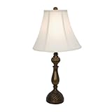Customer review from the Amazon Vine Program This is a basic candlestick base table lamp. The finish is in antique bronze though the base is made of resin. The finish looks metallic unless you are really closely inspecting the lamp base. The shade is a light tan fabric.If you have a nice, open place to put this lamp, it is an attractive addition to any room or space. The lamp is tall and the shade is about the size you would expect from a table lamp. The fabric seems to be of fairly good quality.