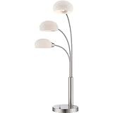 Just received this lamp and I am quite pleased. The lamp is tall and the shades are not in a straight row but gradually come away from the lamp with the top one being the one that is furthest away. The lamp must be placed on a table that is at least 17 inches in depth, depth being measured from the front of the table to the back of the table, no smaller. The width of the table that it is placed on should be at least 20" wide from the left side of the table to the right side of the table. If placed on a smaller surface the highest of the 3 shades will probably stick out over the table. Anyone walking nearby can easily brush against the shade and down goes the lamp, shades and all. You have the ability of using 1, 2 or 3 of the lights. You can dim them or for reading make them as bright as they are capable of being. The switch is located on the lamp base. I would have given this 5 stars had the arms been adjustable. A few years ago I purchased a lamp which also had arms like these the only difference being that the arms on the lamp which I purchased awhile ago are adjustable. When reading you can adjust the arms so that you can place the light where you feel it is the most comfortable and advantageous. For some reason the lamps that are sold today that are similar looking to these do not come with adjustable arms. Nevertheless this is a very attractive lamp which is also functional giving off quite a bit of light. It takes 3 halogen bulbs which can get extremely hot but give off more light then a regular bulb. I had the lamp facing forward and was able to read my book without any problem regarding having enough bright light to read by. Light dusting is all that is needed. Any dusting should be done when the lamp has been off for a while and is not hot. Considering that the arms are not adjustable this lamp is quite adequate for any activity that requires a bright light and is an attractive addition to any room.