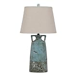 I read a previous good review and although I wasn't sure if the color would be as blue as I wished, I took the chance and bought these because after an exhaustive search for "just the right" lamps....I just wanted to give up!!!.... I was going for a rustic informal feeling in my lake house.....I mostly couldn't make myself pay the high price of most lamps I found searching all over the internet...Resigned, I bought these because the price was right... They arrived packaged perfectly. No broken or missing parts. I truly didn't expect to be soooo happy!!!! The lamps are very substantial in weight. I have never had a lamp with an oval shade. It does have a seam but it isn't really noticeable and I like it....Since I was pairing with a denim comforter, the color, as I suspected, was more of a blue/ green than I had hoped, but they worked beautifully because the same thing was true with the curtains/drapes I found (also on amazon)... If you like, go see my choice for the windows by plugging in " RLF HOME Duncaster " in blue plaid. They too were blue greenish....A designer couldn't have done better! My luck this time! I'm way too cheap to use a professional. And even though sometimes it is hard to make a choice, I really do enjoy doing it myself. I can't wait to show this room off to my next overnight guest. Price was half or even better than that from all others that might be considered equal. Hope this helps in your search.Best Deals for Ashley L140644 Glazed Ceramic Table Lamp, Antique Teal, 2-Pack