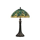 You do get what you pay for ... I chose not to spend $500+ for a good-quality Tiffany-style lamp, so was somewhat disappointed in this piece. The lamp is attractive, but is not as described. You should know that the shade measures only 15" across and is NOT glass but is instead a hard plastic / acrylic. I agree with the reviewer who said the colors are brighter than pictured, but it really depends on the light in the room. (And of course, the brighter colors shine through when the lamp is lit with the max 120 watts with 2 lightbulbs.) The lamp is also NOT "dimmable" as described; a toggle switch on the cord is either on or off. I purchased this as a reading lamp, but will use it as an accent piece; the "blue" light cast is not comfortable for reading. Kudos to Amazon's standard shipping, which I chose instead of free shipping. I ordered the lamp on a Thursday and received it 2 business days later. All that said, this is an attractive lamp, and I have received many compliments on it.